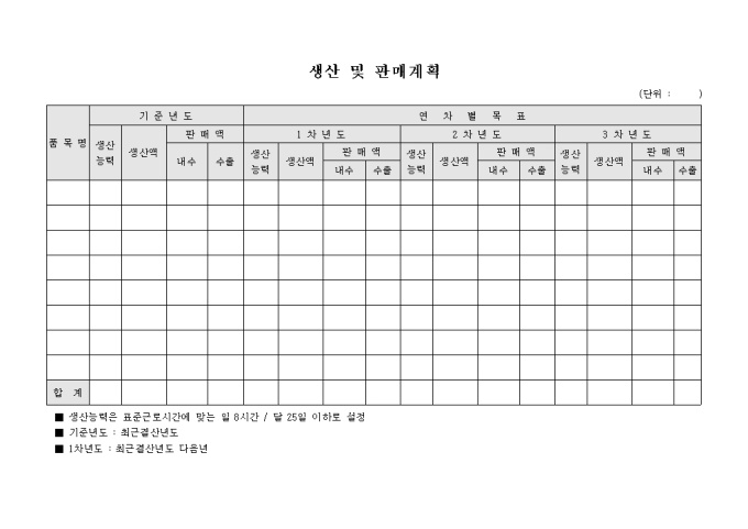 9,000원/월최근결산년도에서 향후 3년간의 생산 및 판매계획을 세워볼 수 있는 서식으로 생산능력, 생산액을 기입 할 수 있으며 판매액이 내수, 수출로 나누어진 서식입니다.