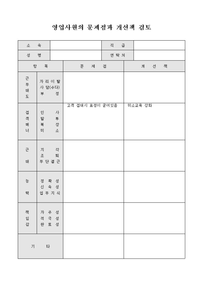 9,000원/월공정작업자의 문제점 및 개선점을 항목별로 세분화하여 작성할 수 있도록 만든 서식입니다.