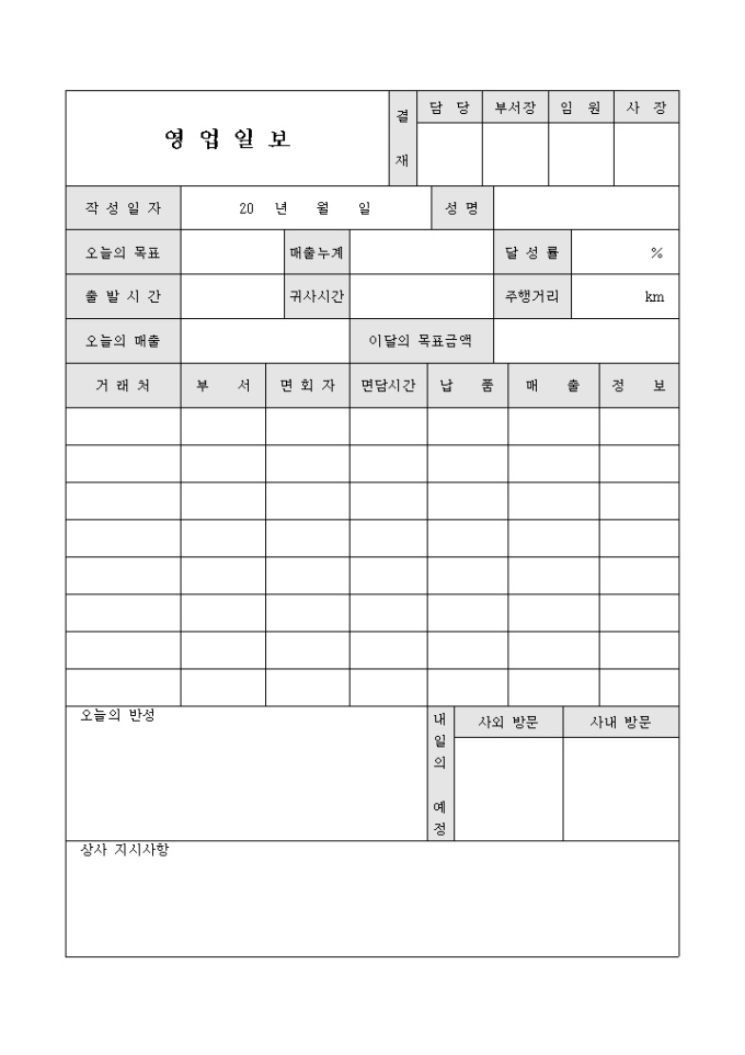 오늘의 목표 및 이달의 목표금액을 기입할 수 있고, 명일 방문예정을 기입할 수 있는 양식의 영업일보입니다
