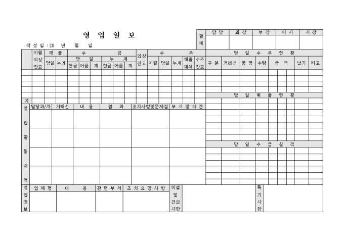 가로로 되어있는 영업일보 서식이며 당일 수주, 수금 현황 및 매출 현황등을 기입할 수 있는 서식입니다.