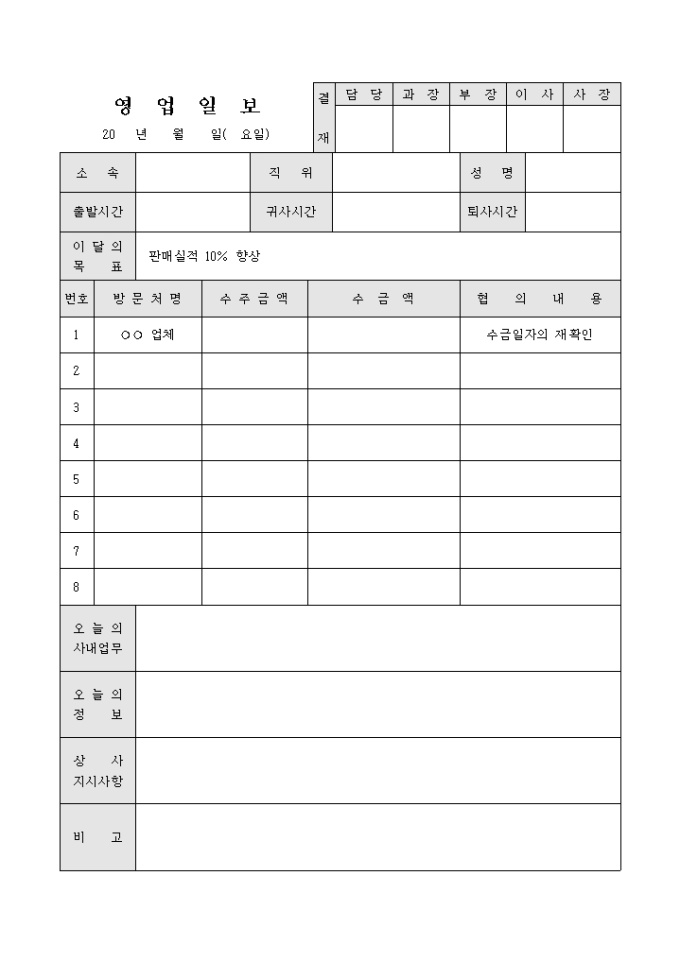 방문처명 및 수주금액, 수금액 등의 사항을 간략하게 기입할 수 있는 영업일보입니다.