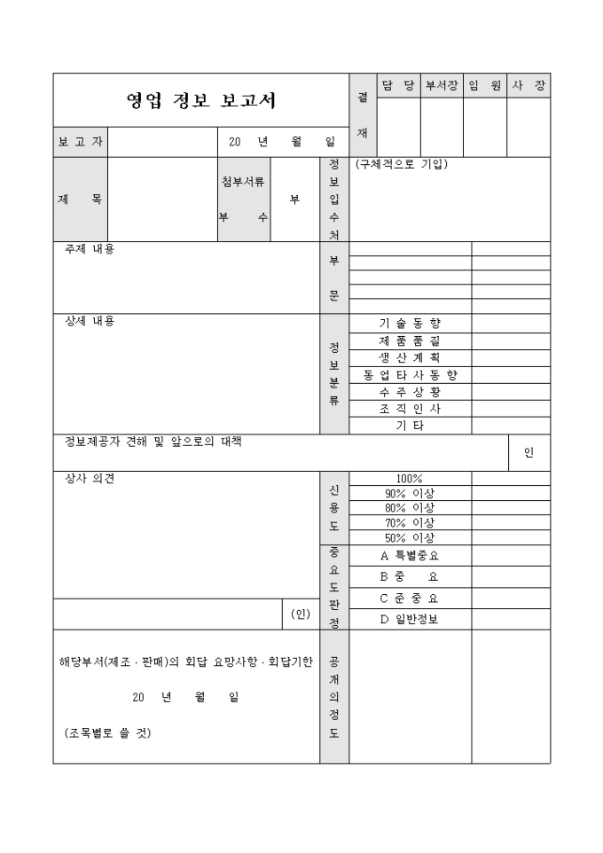 9,000원/월영업 정보 보고서로 제목, 주제내용, 상세내용, 대책, 상사의견, 정보입처, 정보분류, 신용도, 중요도 등의 항목으로 구성되어 있습니다.