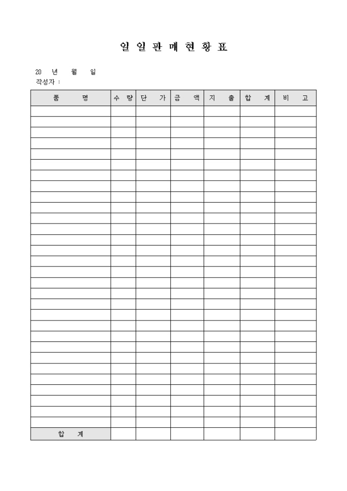 9,000원/월일일 판매현황표로 품명, 수량, 단가, 지출, 금액, 합계란으로 구성되어 있습니다.