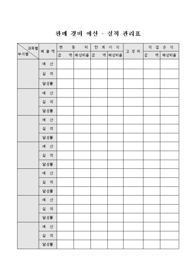 9,000원/월판매 경비 예산 실적관리표로 매출액, 변동비, 한계이익, 고정비, 직접손익 등으로 구성되어 있습니다.