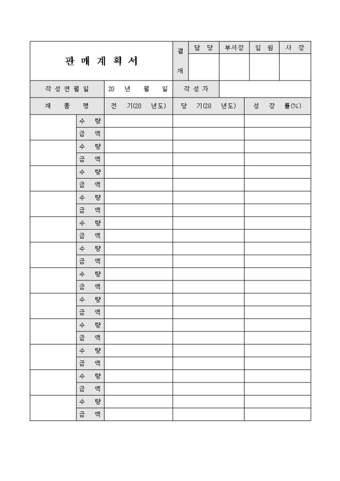 9,000원/월판매계획서 양식으로 제품명, 전기, 당기, 성장률로 구성되어 있습니다.