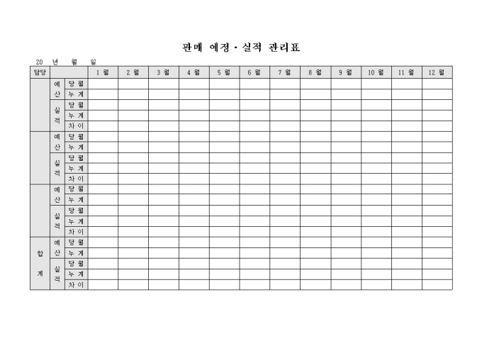 판매 예정 실적관리표로 월별 예산, 실적에 관해 기록하는 양식입니다.
