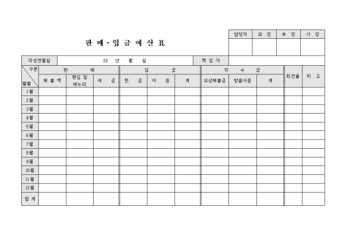 9,000원/월판매 입금 예산표로 월별, 판매, 입금, 미수금, 회전율 등의 항목으로 구서되어 있습니다.