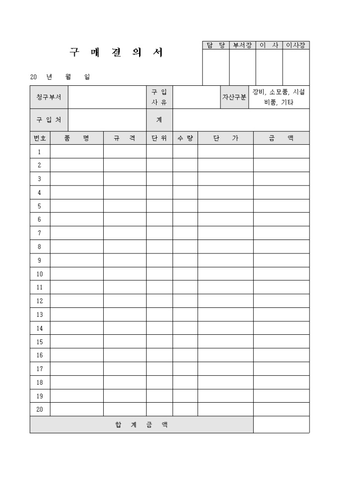 9,000원/월부서에 필요한 물품 구매를 상급부서에 건의하는 구매결의서로 자산구분으로 장비, 소모품, 시설, 비품, 기타 등의 항목을 기입하시면 됩니다.)