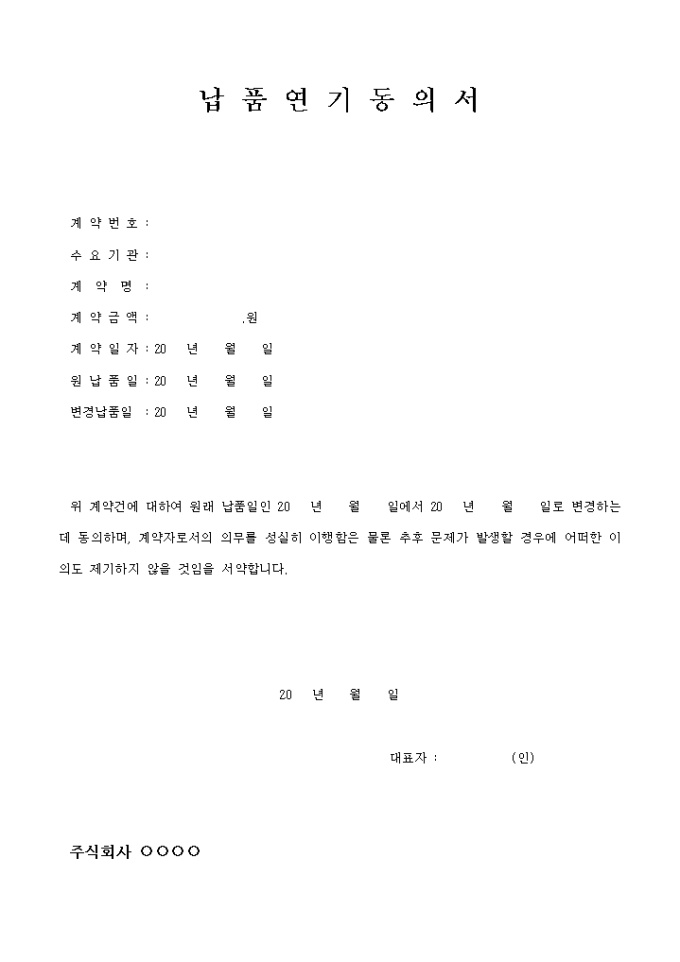 납품일을 연기해야 할 상황이 발생 할 경우 거래처에 납품연기를 요청하고 그를 동의한다는 확답의 동의서입니다.