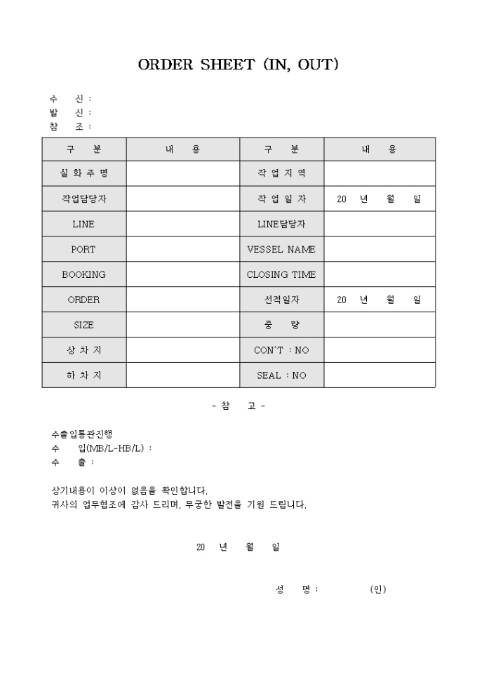물류 확인서로 수신, 발신, 참조, 구분, 내용, 참고 사항등의 항목으로 구성되어 있습니다.
