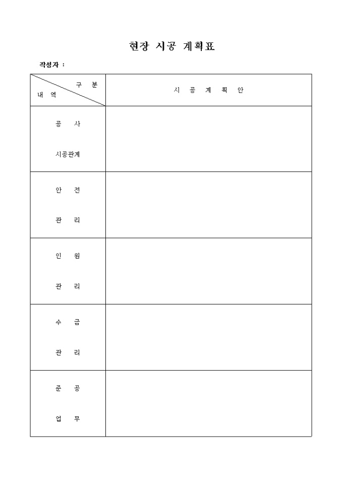 공사 시공관계,안전관리,인원관리,수금관리,준공업무등의 항목으로 구성된 양식입니다.