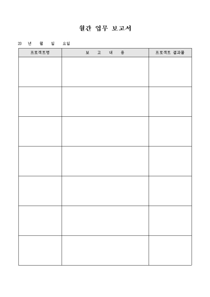 9,000원/월한달간의 업무보고를 할 때 작성하는 보고서 양식으로 사업명, 보고내용으로 구성되어 있습니다.