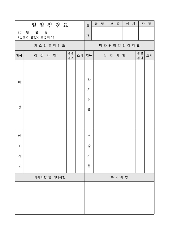 일일점검표로 가스일일점검, 방화관리일일점검, 지시사항, 특기사항등의 항목으로 구성되어 있습니다.