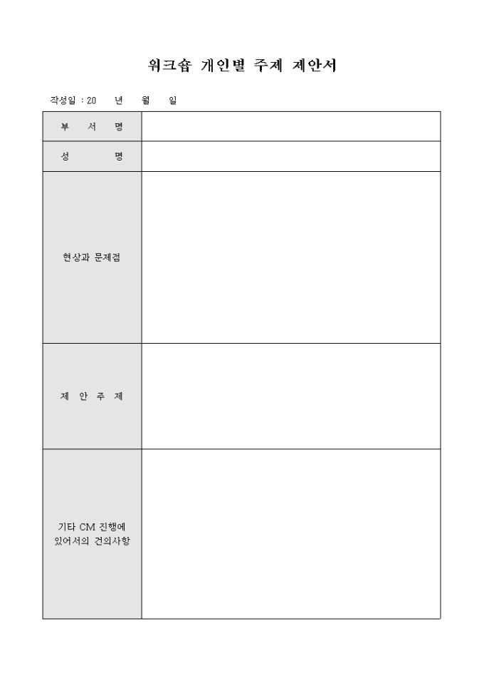 9,000원/월워크숍 개인별 주제 제안서로 부서명, 성명,현상과 문제점, 제안주제, 건의사항 등의 항목으로 구성되어 있습니다.