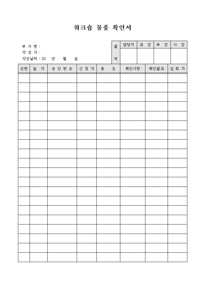 9,000원/월워크숍 물품확인표로 일자, 승인번호, 신청자, 용도, 확인사항, 확인결과, 입회자 등의 항목으로 구성되어 있습니다.