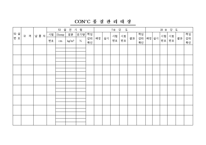9,000원/월CNCC품질관리대장 입니다. 타설번호, 규격, 납품처, 타설전시험, 강도등의 세부 항목으로 구성된 양식입니다.