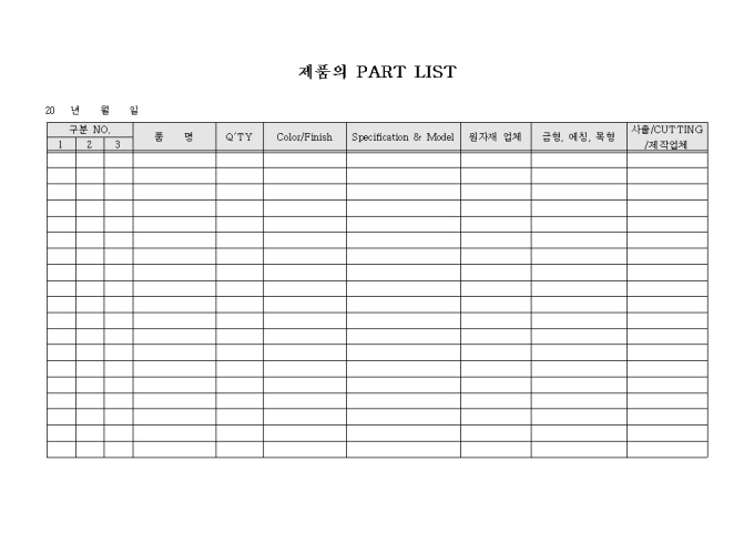 9,000원/월제품의 Part list로 품명, 퀄리티, 컬러, 원자재업체, 금형, 사출등의 항목으로 구성되어 있습니다.