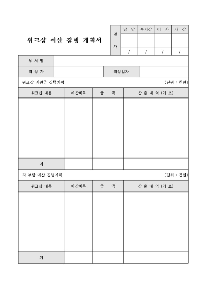 9,000원/월워크샵의 예산 집행 계획서 양식입니다. 워크샵에 대한 지원금과 자부담금으로 나누어 해당 워크샵 내용, 예산비목, 금액, 산출내역 등을 기재할 수 있습니다.