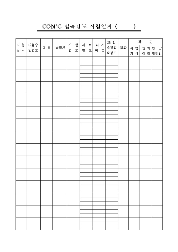 9,000원/월CNCC압축강도시험일지 입니다. 시험일자, 타설승인번호, 규격, 납품처, 시험번호, 시료번호, 파괴하중등의 항목으로 구성된 양식입니다.