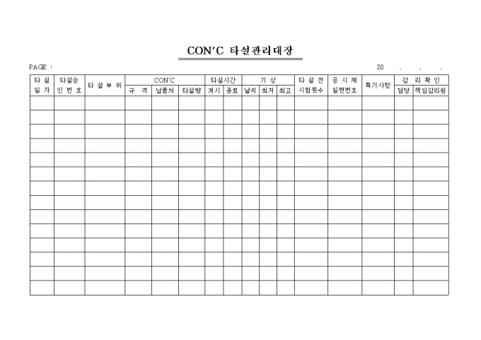 CONC타설관리대장 입니다. 타설일자, 타설부위, CONC, 타설시간, 기상, 타설전 시험횟수등의 항목으로 구성된 양식입니다.