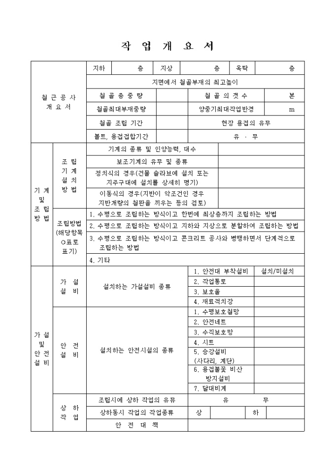 철근공사 개요서, 기계 및 조립방법, 가설 및 안전설비등의 세부 항목으로 구성된 양식입니다.