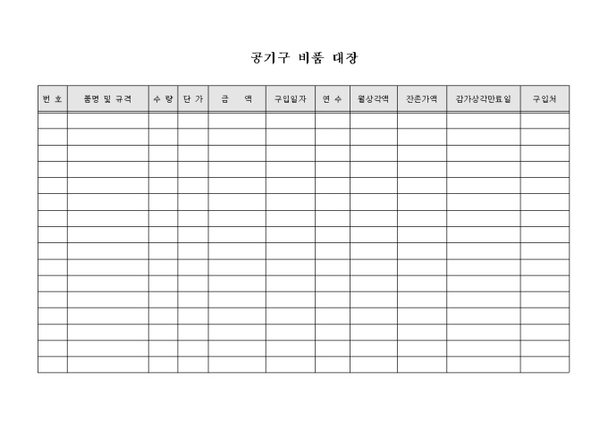 공기구비품을 관리하기 위한 서식으로 품명, 구입일자, 월상각액, 잔존가액, 감가상각만료일 등의 항목으로 구성되었습니다.