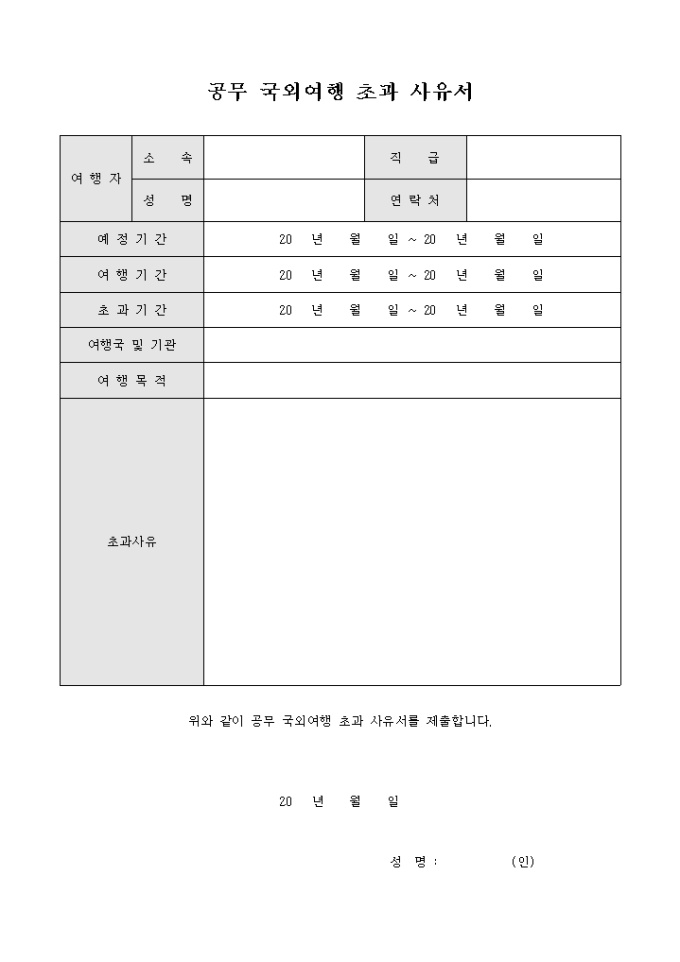 9,000원/월공무로 국외 여행을 갔다가 그 일정보다 늦어질 경우 그 사유를 기입하여 제출하는 서식입니다.
