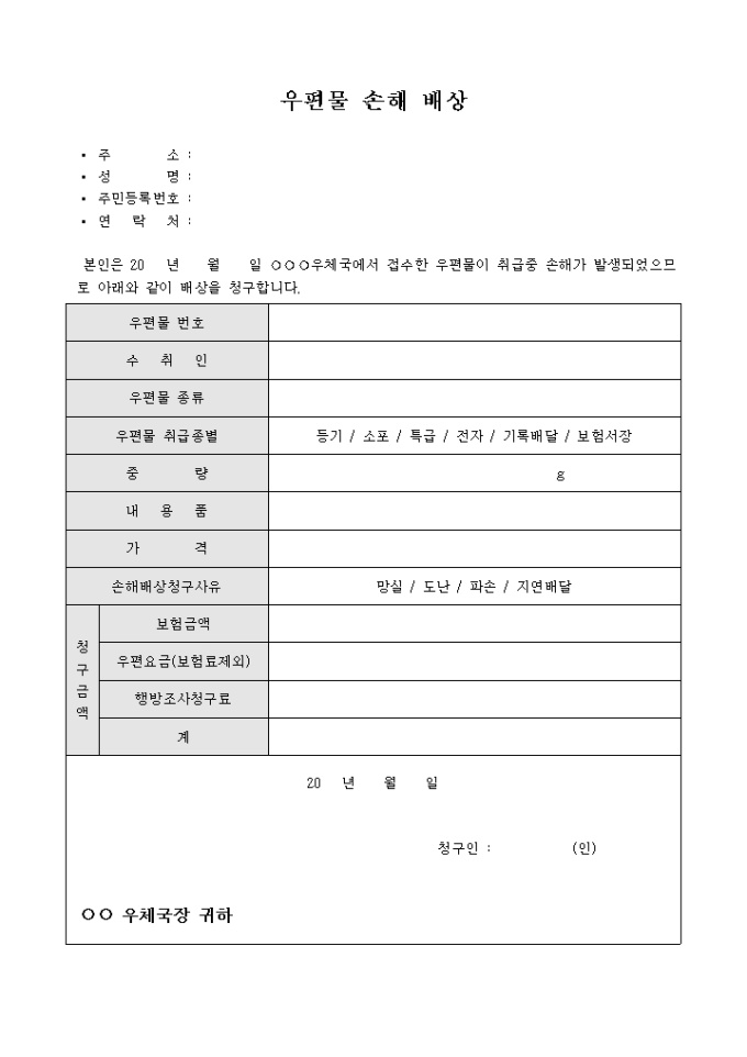 9,000원/월우체국의 취급부주의로 우편물 손상이나 손해가 발생하였을때 이를 우체국에 보상신청하는 내용의 신청서입니다.