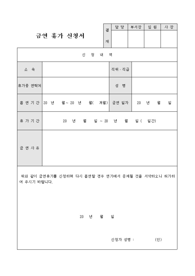 9,000원/월금연 휴가를 신청하기 위한 서식으로 흡연기간, 금연일자, 금연사유 등을 기입할 수 있는 서식입니다.