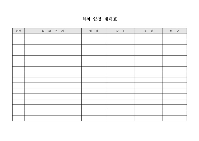9,000원/월회의 일정의 계획을 알아볼 수 있는 서식으로 회의일정, 주제, 장소, 주관 등의 항목으로 구성되어 있습니다.