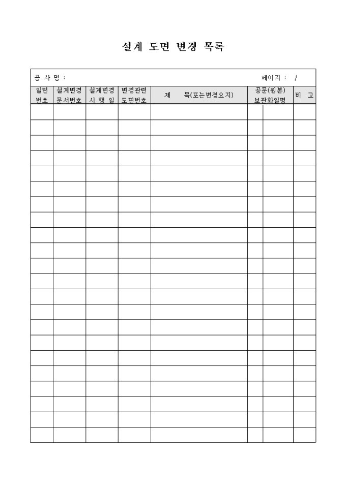9,000원/월설계도면의 변경 사항을 기록하는 설계도면 변경목록표 양식입니다. 일련번호, 문서번호, 설계변경 시행일, 도면번호, 제목 등의 항목을 기재할 수 있습니다.