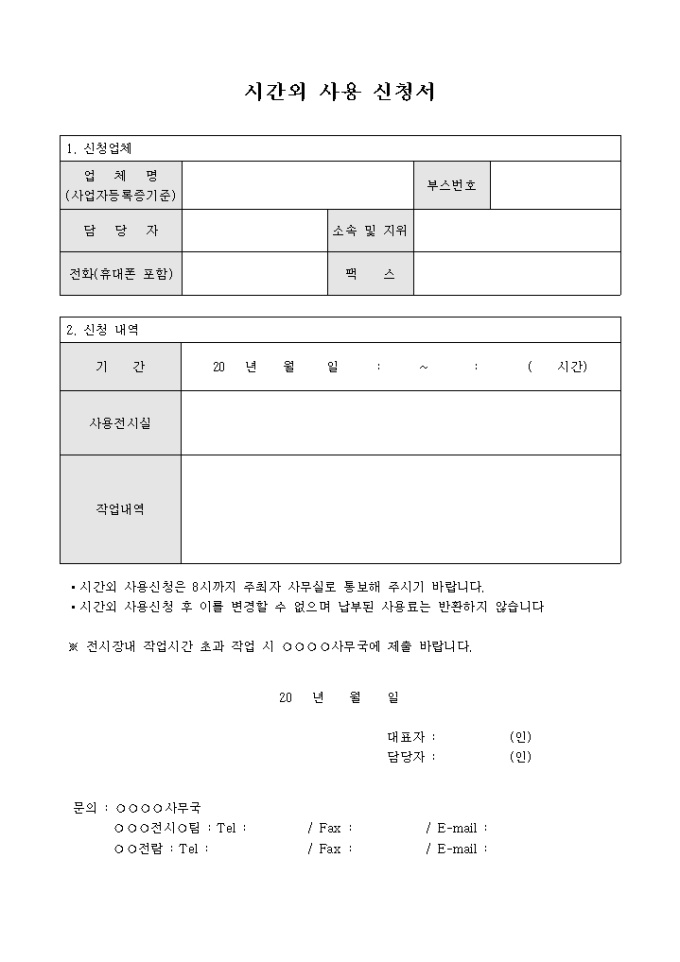 9,000원/월전시회장내에서 작업을 위한 시간외 신청서 양식입니다. 신청업체의 업체명, 부스번호, 담당자, 소속, 지위, 전화번호와 신청내역 등을 기재할 수 있습니다.
