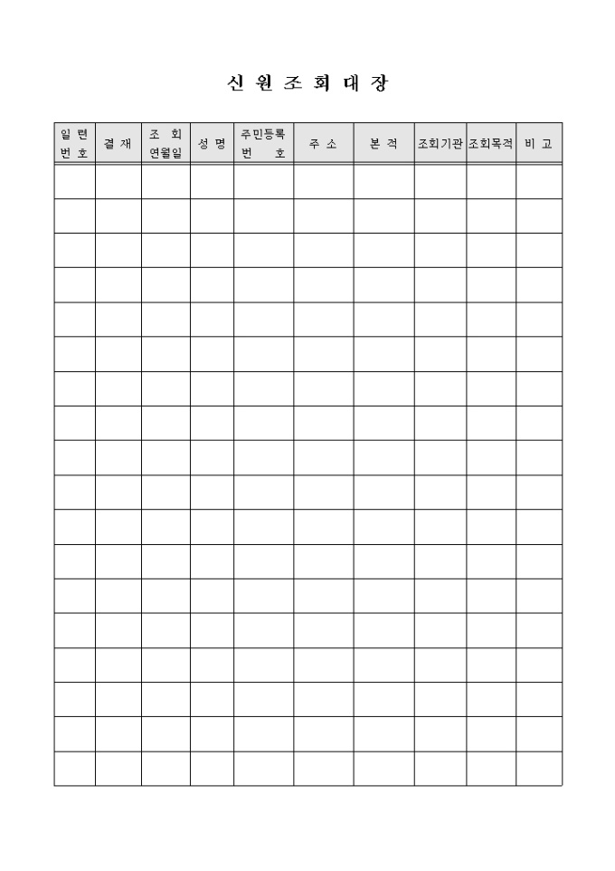 간략한 형태의 신원조회 대장 양식입니다. 일변번호, 결재, 조회년월일, 성명, 주민등록번호, 주소, 본적, 조회기관, 조회목적 등의 항목을 기재할 수 있습니다.