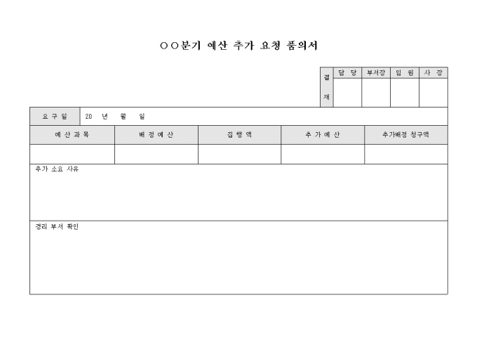 9,000원/월예산 추가 요청 품의서 양식입니다. 요구일, 예산과목, 배정예산, 집행액, 추가예산, 추가배정청구액과 추가소요 사유, 경리부서 확인등의 항목을 기재할 수 있습니다.