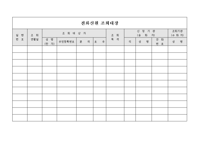 전화신원 조회 대장입니다. 전화로 신원확인한 내용을 기록할때 사용됩니다.
