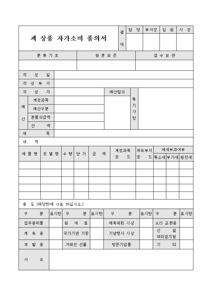 제상품자가 소비품의서 입니다. 제품명과 수량, 단가, 금액등을 기록할수 있습니다.