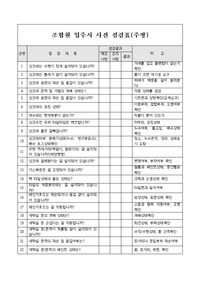 조합원 입주시 사전에 점검할 내용들을 기록한 점검표입니다.