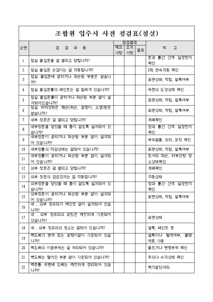 조합원 입주점검표(침실)