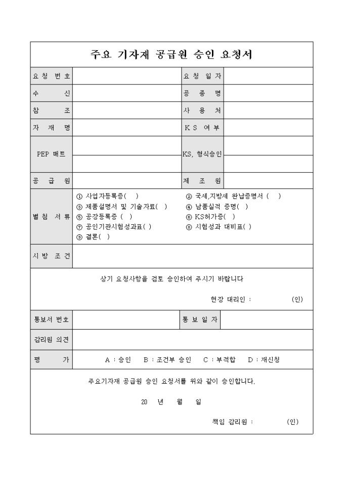 주요 기자재 공급원 승인 요청서 입니다. 요청일자와 요청 자재,조건등을 기록하여 승인요청시 사용되는 문서입니다.