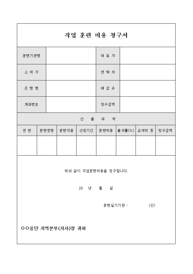9,000원/월직업훈련 비용 청구서 입니다. 직업훈련비용의 산출내역을 기록하여 청구시 사용되는 문서입니다.