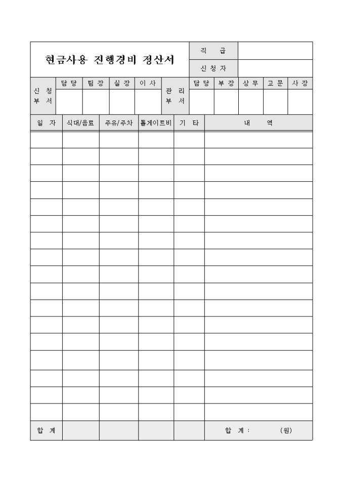 현금사용 진행경비 정산서 입니다. 현금사용 경비를 정산하고자 할때 사용됩니다.