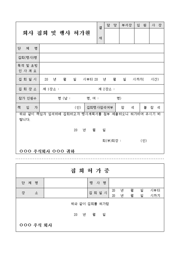 9,000원/월회사집회 및 행사 허가원입니다. 회사 집회 및 행사를 허가받고자 할때 사용되는 문서입니다.