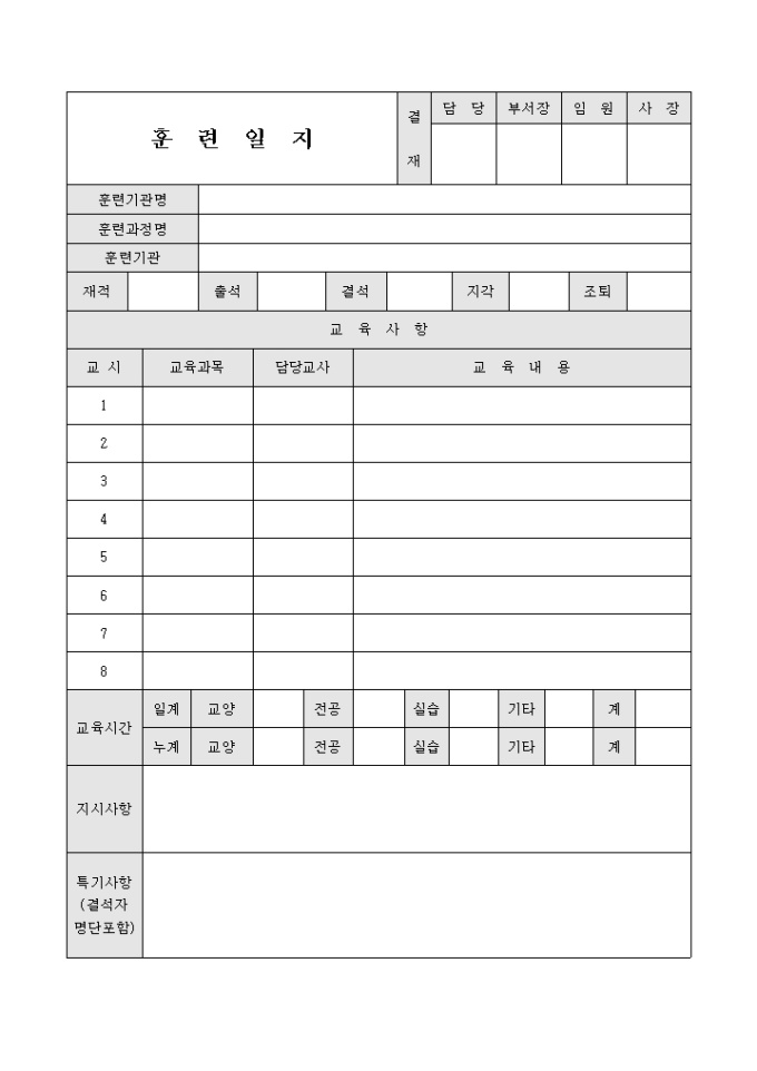 9,000원/월훈련일지입니다. 시간별 교육과목과 담당교사, 교육내용등의 기입이 가능합니다.