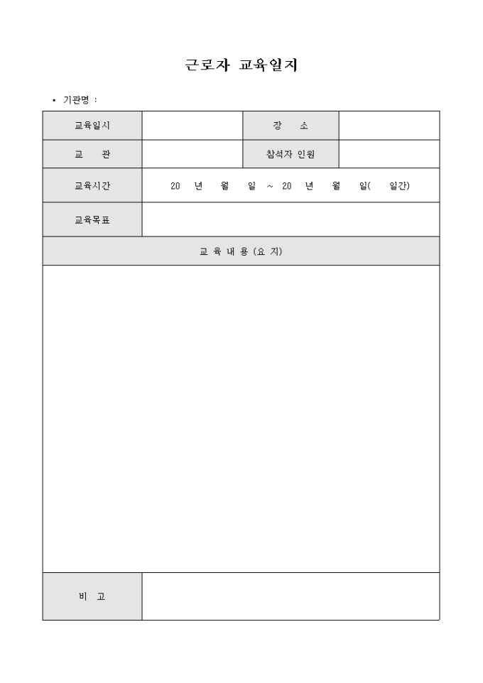 기관에서 근로자를 교육하고 그 결과를 기록하는 일지로 교육일시, 장소, 교관, 참석자수, 교육목표와 교육내용을 서술형으로 작성할 수 있는 서식입니다.