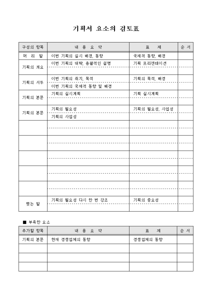 9,000원/월기획서 요소의 검토표로 자신이 기획서에 넣고 싶은 내용을 간략하게 기입하고 그를 바탕으로 기획서를 작성하는 서식으로 간단한 예시가 포함되어 있습니다.