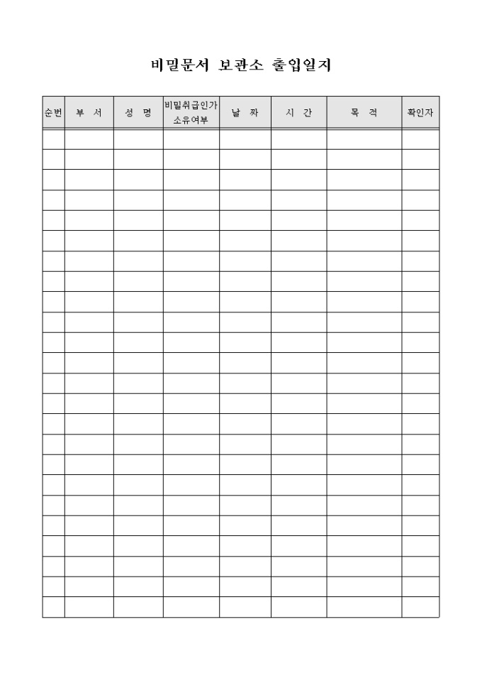 비밀문서보관소에 출입하는 사람들을 관리하기 위한 서식입니다.