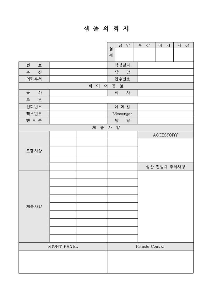 9,000원/월바이어정보, 제품사양 등이 포함되어 있는 샘플의뢰서입니다.
