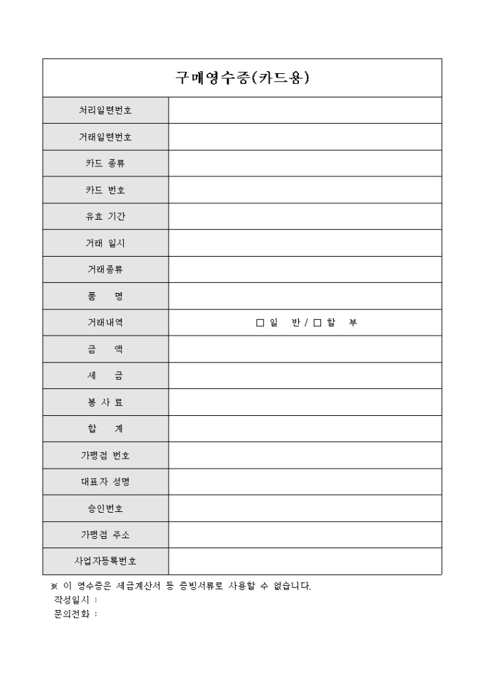 9,000원/월카드 사용후 임시로 발급하는 영수증으로 세금계산서 등의 증빙서류로 사용할 수는 없으며 가맹점 번호, 금액, 처리 및 거래 일련번호 등이 있습니다.