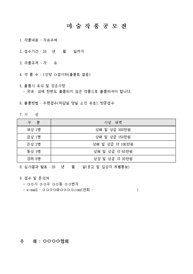 9,000원/월협회에서 주최하는 미술작품 공모전에 대한 서식으로 제출일자, 심사일자, 부상 등의 내용이 포함되어 있는 서식입니다.