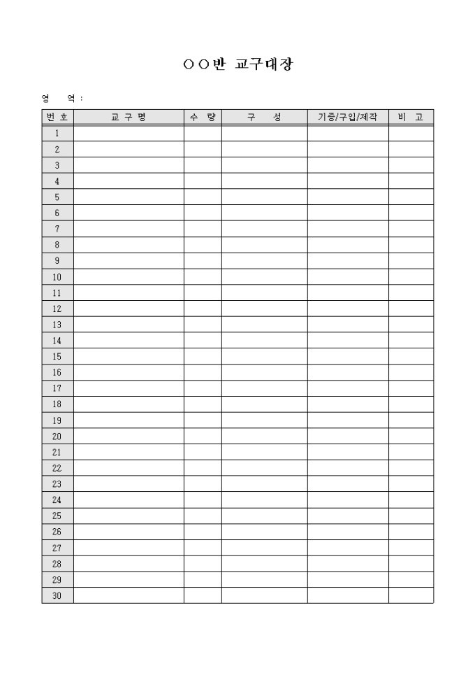 9,000원/월교육기관에서 사용하는 교구대장으로 교구명, 수량, 구성, 기증/구입/제작 등의 항목으로 구성되어 있습니다.
